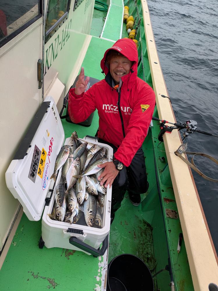 朝イチ…反応少なく動きもあり苦戦しましたが今日はお魚さえ出てしまえば手慣れた方2名様でしたので交互に上げ下げでコマセ切らさすチームプレイ!アジも全部良型のメガ、ギガアジ!